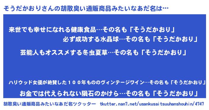 ヘコむあだ名 | 『そうだかおり(震え声)』『そうもー』 |