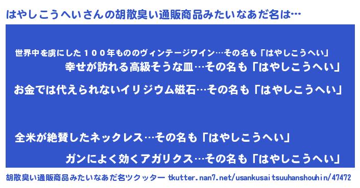 | 意味不明あだ名 | 『なめこ科はやしこうへい属』 |