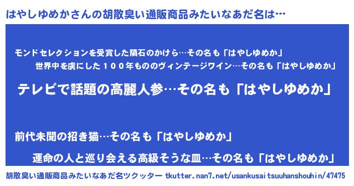 | 意味不明あだ名 | 『自称はやしゆめか』 |