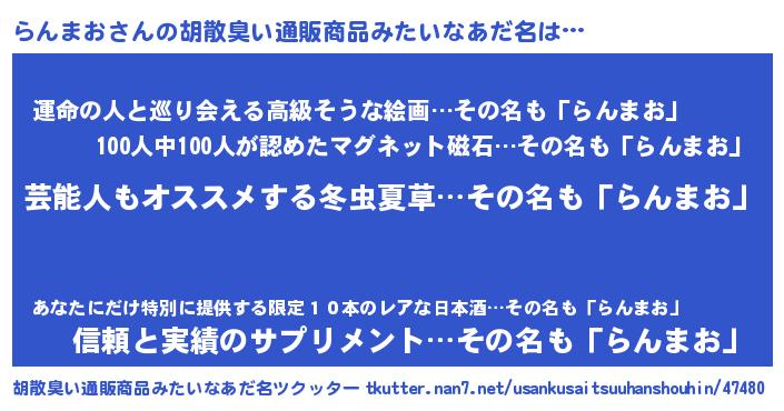 | 男性向けラノベタイトル風あだ名 | 『うちのらんまおが世界を掌握している!』 |