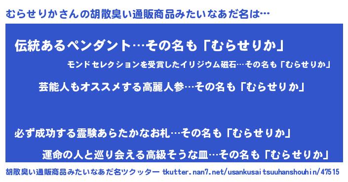 | 意味不明あだ名 | 『自称むらせりか』『ペロリンむらせりか』 |