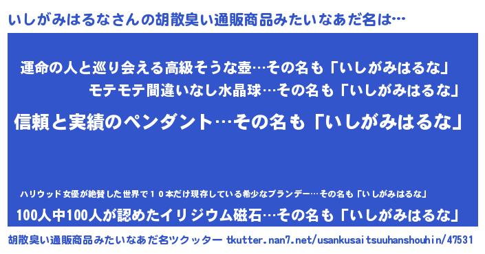 | 意味不明あだ名 | 『とにかく怪しいいしがみはるな』 |