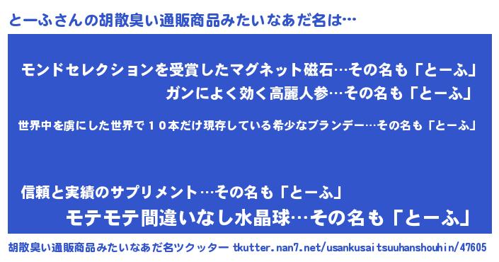 | 肩書あだ名 | 『とーふプロデューサー』『とーふ教官』 |