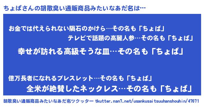 | 肩書あだ名 | 『ちょば中将』『ちょば総理大臣』 |