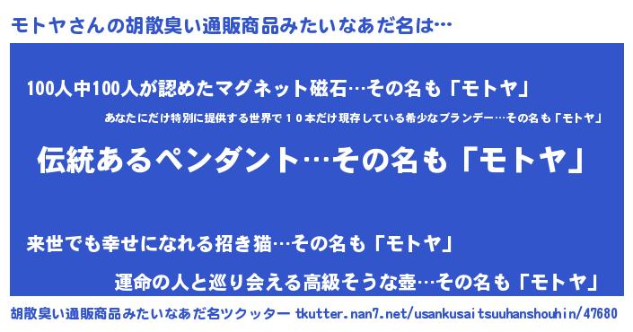 | 男性向けラノベタイトル風あだ名 | 『モトヤの嫁は女の子じゃないと思った?』 |