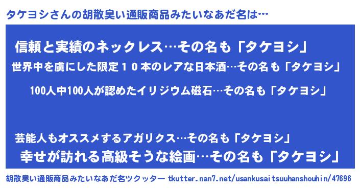 | ヒーロー風カッコイイあだ名 | 『友情の使者タケヨシ』『黄金騎士タケ』 |
