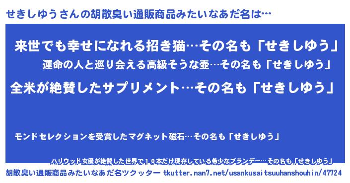 | 男性向けラノベタイトル風あだ名 | 『せきしゆう~年齢イコール彼女いない歴の魔法使い~』 |
