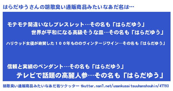 | 男性向けラノベタイトル風あだ名 | 『魔弾の王とはらだゆう』 |