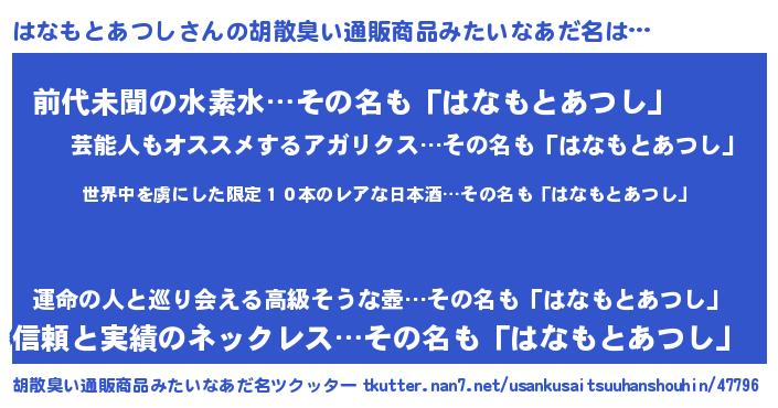 | ヘコむあだ名 | 『はなもとあつし(笑)』『はなぷりん』 |