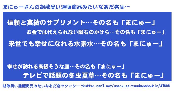 | 意味不明あだ名 | 『永久保存まにゅー』『自称まにゅー』 |