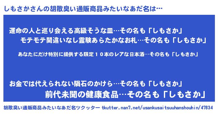 | 意味不明あだ名 | 『住所不定無職しもさか(56歳)』 |