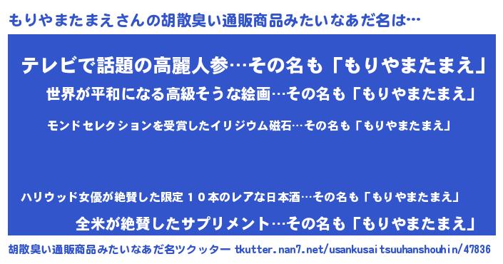| 男性向けラノベタイトル風あだ名 | 『もりやまたまえ~年齢イコール彼女いない歴の魔法使い~』 |
