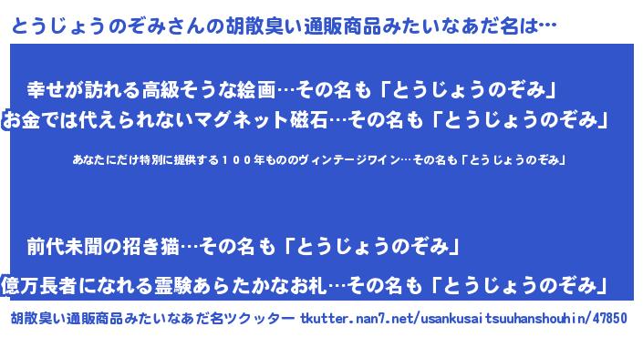 | 意味不明あだ名 | 『住所不定無職とうじょうのぞみ(7歳)』 |