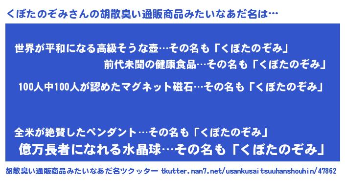 | 男性向けラノベタイトル風あだ名 | 『おまえをオタクにしてやるから、俺をくぼたのぞみにしてくれ! 』 |