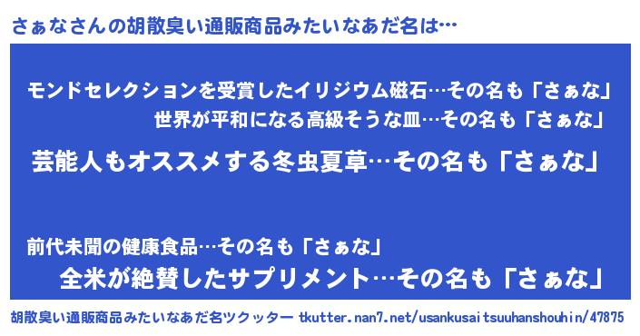 | ヒーロー風カッコイイあだ名 | 『究極戦士サァナ』『天空の使者さぁな』 |