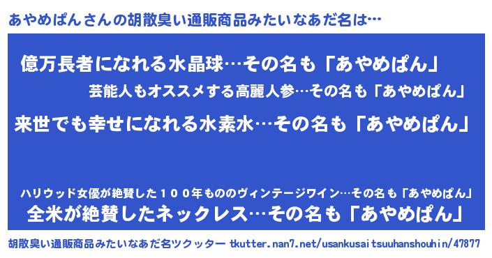 | ヘコむあだ名 | 『あやめぱん(震え声)』『あやにゅー』 |
