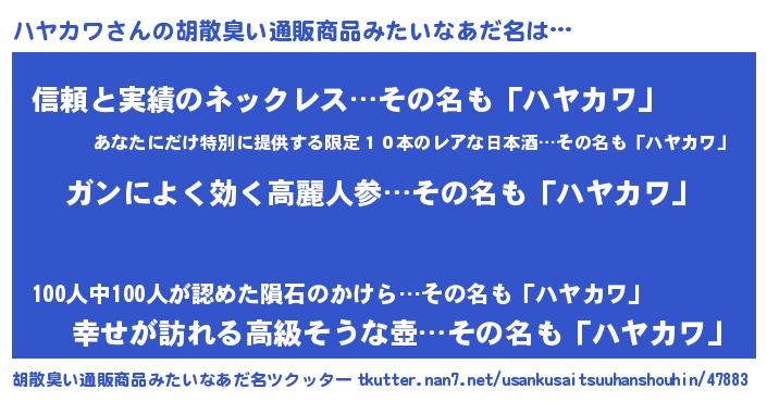 | ヒーロー風カッコイイあだ名 | 『ウルトラ戦士ハヤカワ』『黄金騎士ハヤ』 |