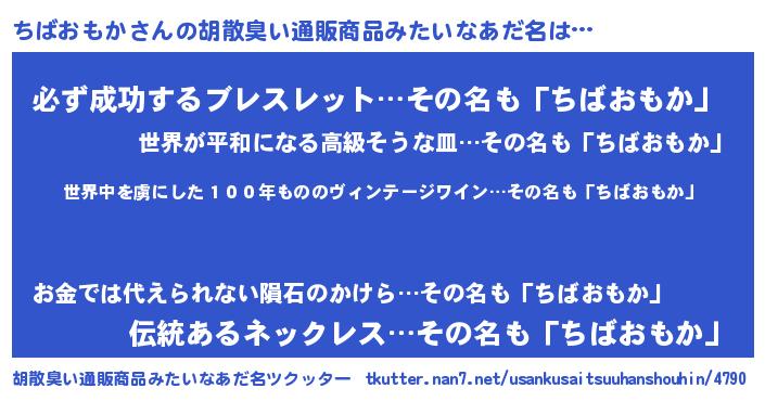 | 男性向けラノベタイトル風あだ名 | 『この素晴らしい世界にちばおもかを!』 |