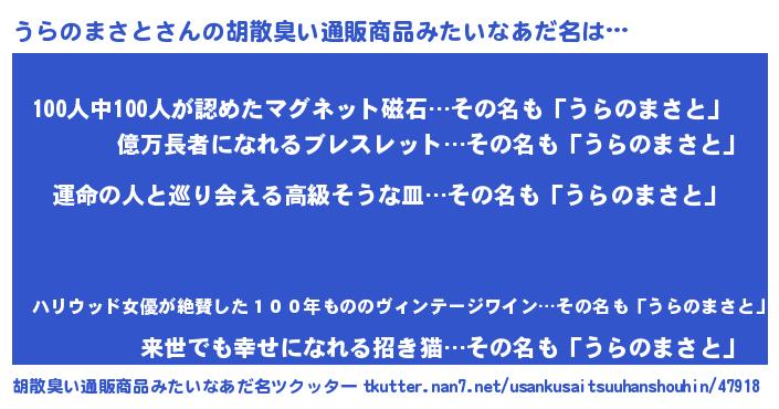 | 肩書あだ名 | 『うらのまさと中将』『うらのまさと社長』 |