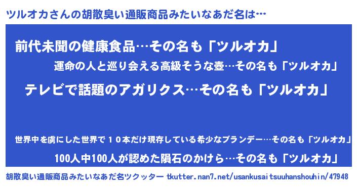 | 男性向けラノベタイトル風あだ名 | 『ツルオカに滅ぼされるだけの簡単なお仕事です』 |