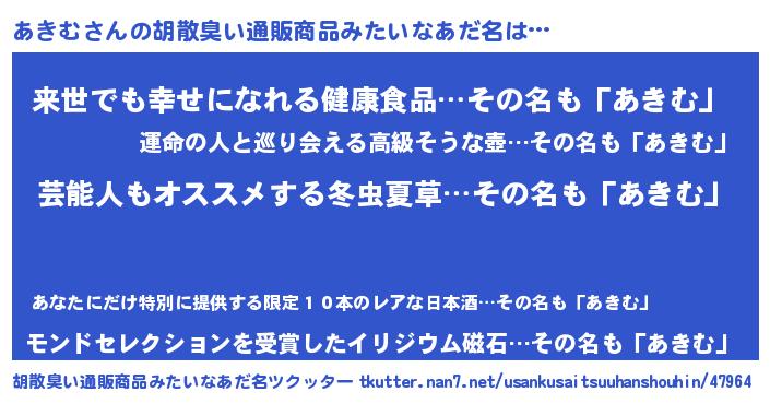 | 男性向けラノベタイトル風あだ名 | 『Re:あきむから始める異世界生活』 |
