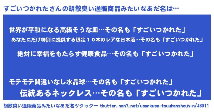 | 男性向けラノベタイトル風あだ名 | 『はたらくすごいつかれたさま!』 |