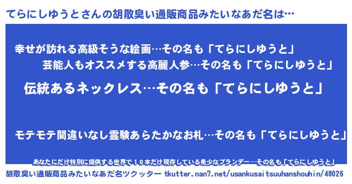 | 男性向けラノベタイトル風あだ名 | 『てらにしゆうとの嫁は女の子じゃないと思った?』 |