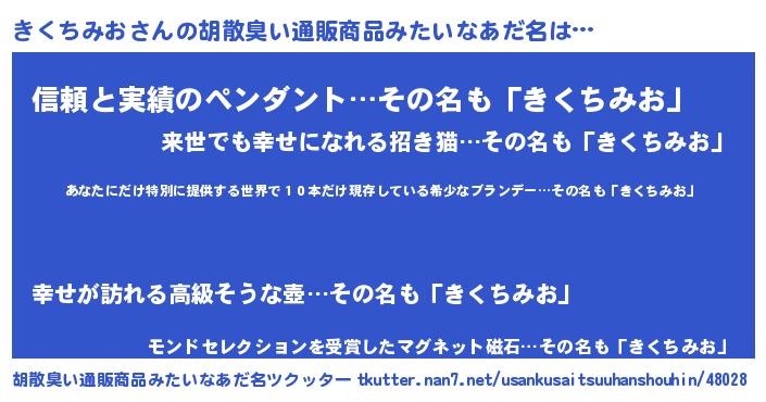 | 意味不明あだ名 | 『住所不定無職きくちみお(71歳)』 |