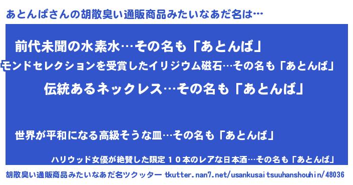 | 男性向けラノベタイトル風あだ名 | 『転生したらあとんばだった件』 |