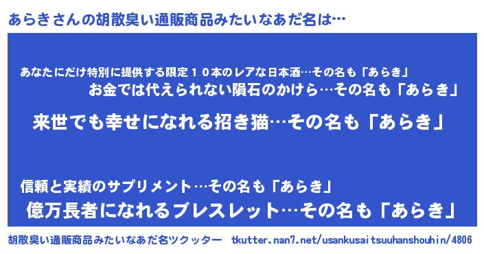 | 欧米人風あだ名 | 『トリンドルあらき』『ダレノガレあらき』 |