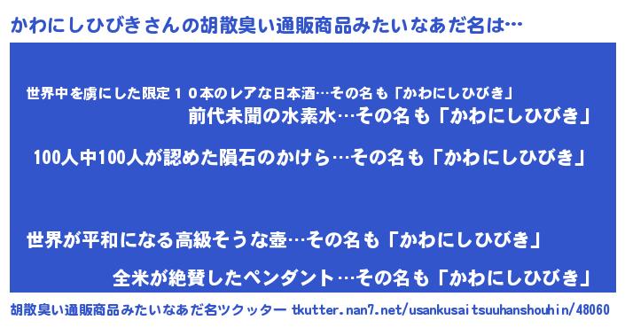 | ヘコむあだ名 | 『かわぷりん』『かわにしひびき(爆)』 |