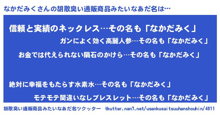 | ヒーロー風カッコイイあだ名 | 『慈愛の使者なかだみく』『黄金騎士ナカ』 |