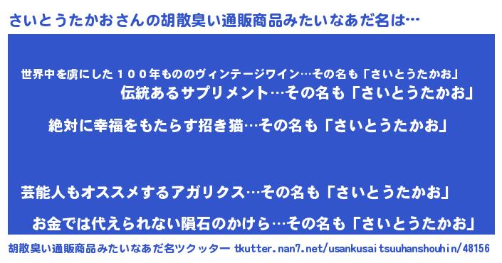 | ヘコむあだ名 | 『さいとうたかお(小並感)』『さいお』 |