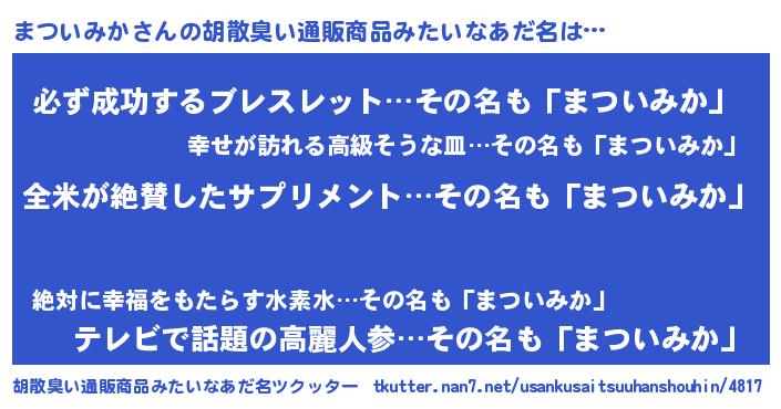 | 意味不明あだ名 | 『とにかく怪しいまついみか』 |