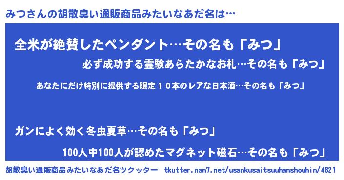 | 意味不明あだ名 | 『住所不定無職みつ(41歳)』『ペロリンみつ』 |