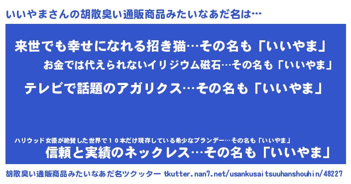 | 男性向けラノベタイトル風あだ名 | 『Re:いいやまから始める異世界生活』 |