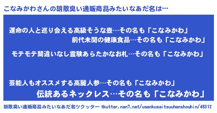 | 恥ずかしいあだ名 | 『プリティーこなみかわ』『こなっちょ』 |