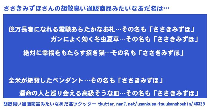 | ヘコむあだ名 | 『ささきみずほ(小並感)』『ささもー』 |