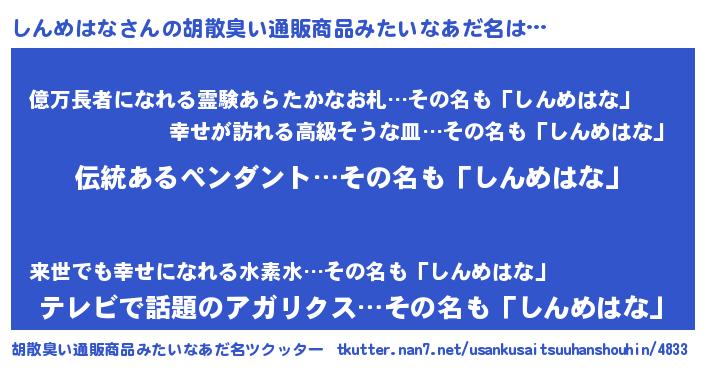 | 意味不明あだ名 | 『とにかく怪しいしんめはな』 |