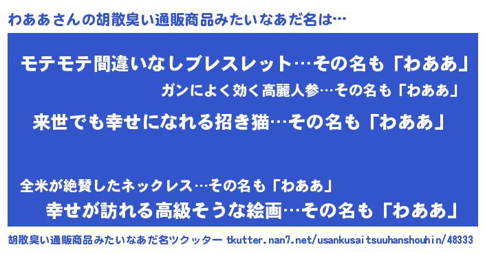 | ヘコむあだ名 | 『わああ(笑)』『わあにー』『つくし』 |