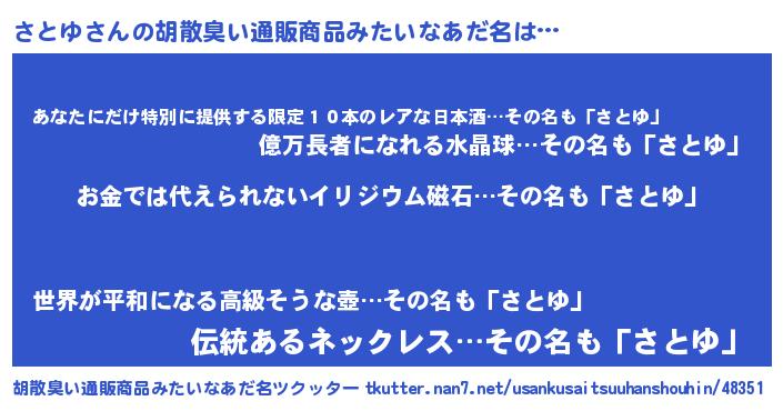 | 男性向けラノベタイトル風あだ名 | 『おまえをオタクにしてやるから、俺をさとゆにしてくれ! 』 |