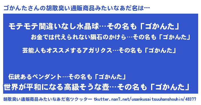 | 男性向けラノベタイトル風あだ名 | 『ゴかんた~年齢イコール彼女いない歴の魔法使い~』 |