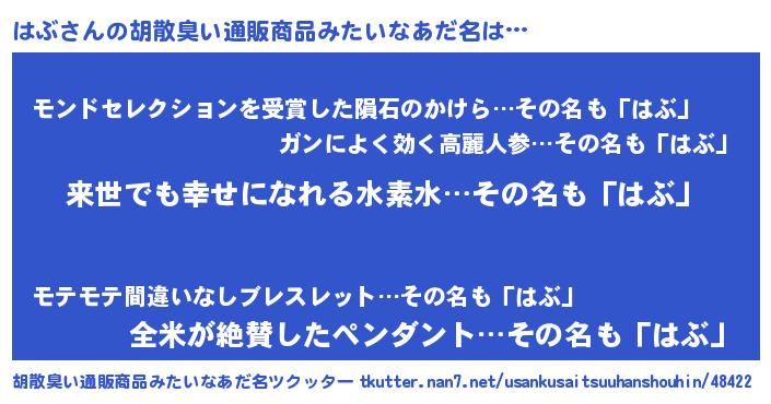 | ヘコむあだ名 | 『はぶ(遠い目)』『はぶっちょ』 |