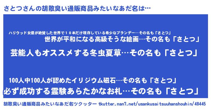 | 男性向けラノベタイトル風あだ名 | 『Re:さとつから始める異世界生活』 |