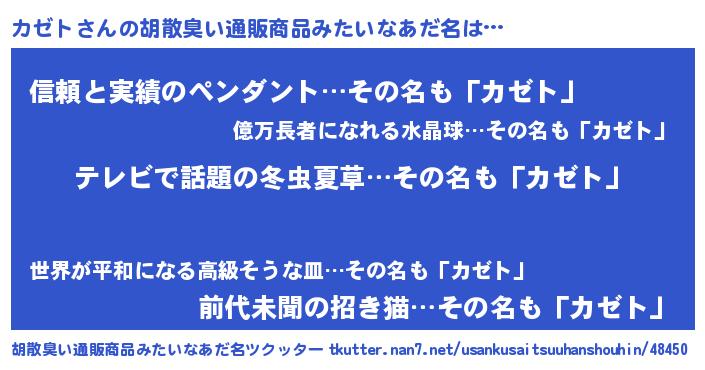 | ヘコむあだ名 | 『カゼぷりん』『カゼト(遠い目)』 |