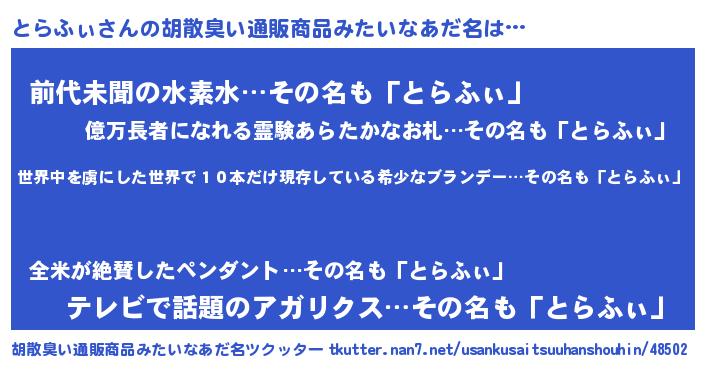 | ヘコむあだ名 | 『とらふぃ(遠い目)』『とらふぇ~』 |