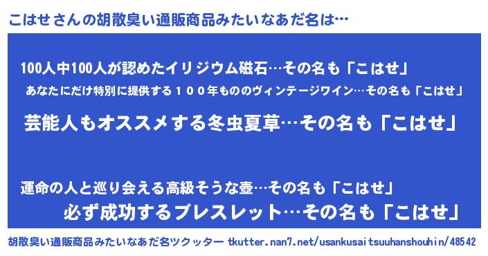 | 意味不明あだ名 | 『ヨモギ科こはせ属』『自称こはせ』 |