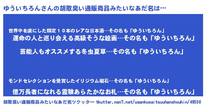 | 男性向けラノベタイトル風あだ名 | 『Re:ゆういちろんから始める異世界生活』 |