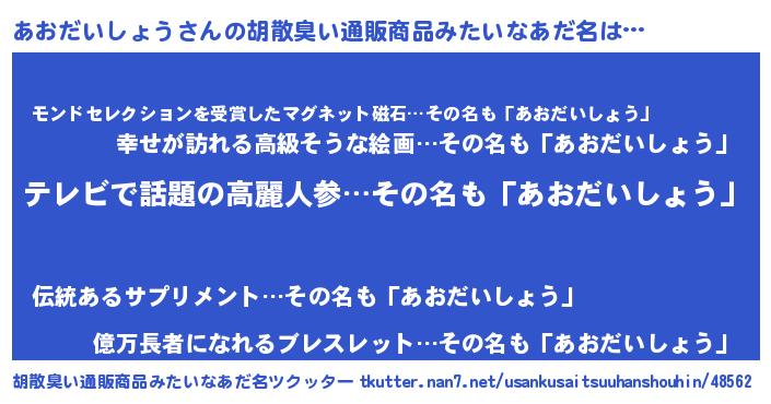 | 男性向けラノベタイトル風あだ名 | 『Re:あおだいしょうから始める異世界生活』 |