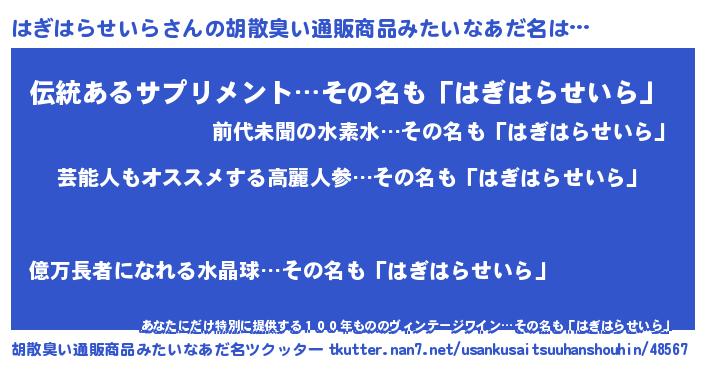 | ヘコむあだ名 | 『はぎ太郎』『はぎはらせいら(小並感)』 |